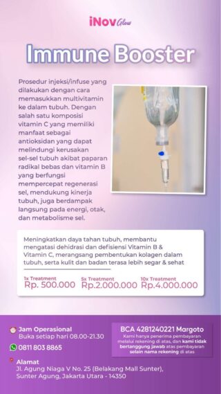 Inovers, Ketika Kamu mencari tempat yang tepat untuk melakukan Perawatan immune booster Terbaik jangan khawatir dan bingung langsung datang dan konsultasi di InovGlow Plastic Surgery. Demi memastikan keamanan pasien, semua kegiatan perawatan dan operasi Inov Glow Klinik sudah didukung oleh peralatan modern dan tim dokter spesialis yang ahli di bidangnya. Untuk informasi lebih lanjut seputar konsultasi dan harga, silakan kunjungi dan hubungi nomor telepon & Whatsapp InovGlow Plastic Surgery.
