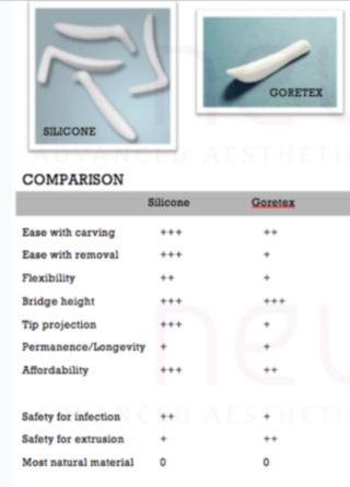 Implan Gore-Tex telah mendapatkan persetujuan lanjutan dari Badan Pengawas Obat dan Makanan AS dan tidak memerlukan tes alergi. Ini adalah implan yang lebih lembut daripada silikon, sehingga mereplikasi tulang rawan hidung alami. Goretex memiliki lubang mikroskopis, yang berfungsi sebagai pori-pori, memungkinkan jaringan lunak hidung di sekitar implan menyusup ke dalam implan dan menempel pada tempatnya.