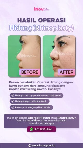 Perlu Inovers ketahui bahwa Operasi Rhinoplasty memberikan hasil yang mancung dan indah pada hidung sesuai dengan yang Inovers inginkan. Bentuk yang mancung dan indah membuat penampilan Inovers makin percaya diri. Pengerjaan operasi Rhinoplasty ini pun hanya berkisar hanya 1 jam saja dengan masa pemulihan yang relatif cepat. Tidak perlu menginap di ruang perawatan setelah operasi ini dilakukan. Bentuk hidung yang sangatlah cantik dan menarik perhatian karena memiliki keunikan tersendiri.