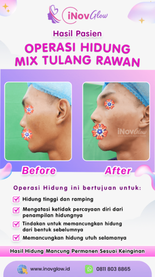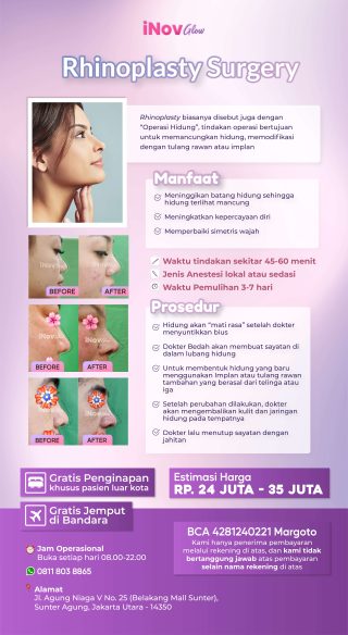 Sudah dapat dipastikan hanya Klinik Kecantikan Inov Glow Plastic Surgery yang memiliki segudang prestasi luar biasa untuk hasil operasi Rhinoplasty dengan tulang rawan. Memiliki dokter spesialis bedah plastik terbaik karena sudah menangani banyak pasien sejak puluhan tahun lalu. Jadi sudah dapat dipastikan Rhinoplasty di Klinik Kecantikan Inov Glow Plastic Surgery adalah solusi bagi mereka yang ingin memiliki hidung mancung namun terlihat alami. Inovers tidak perlu khawatir dengan reputasi yang dimiliki Klinik Kecantikan Inov Glow Plastic Surgery. Segera datang dan hubungi nomor hotline dibawah ini dan pastikan mendapat promo-promo spesial lainnya. Klinik Kecantikan Inov Glow Plastic Surgery solusi cantik hidung mancung dengan hasil alami.